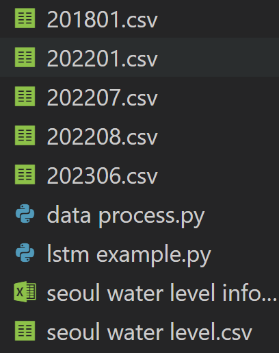 ['201801.csv', '202201.csv', '202207.csv', '202208.csv', '202306.csv', 'data process.py', 'lstm example.py', 'seoul water level info.xlsx', 'seoul water level.csv']